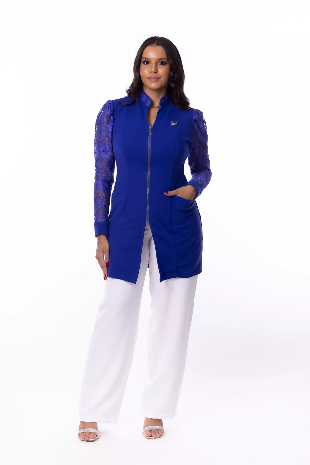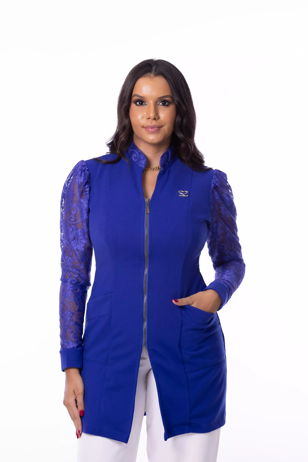 Seu grande diferencial está nas mangas de renda delicadas, que trazem leveza e refinamento ao look profissional. A gola padre adiciona um toque sofisticado, enquanto o fechamento frontal com zíper garante praticidade e modernidade. Com modelagem ajustada, esse jaleco valoriza a silhueta sem comprometer o conforto. Além disso, os bolsos frontais oferecem funcionalidade para o dia a dia, tornando a peça ainda mais completa.