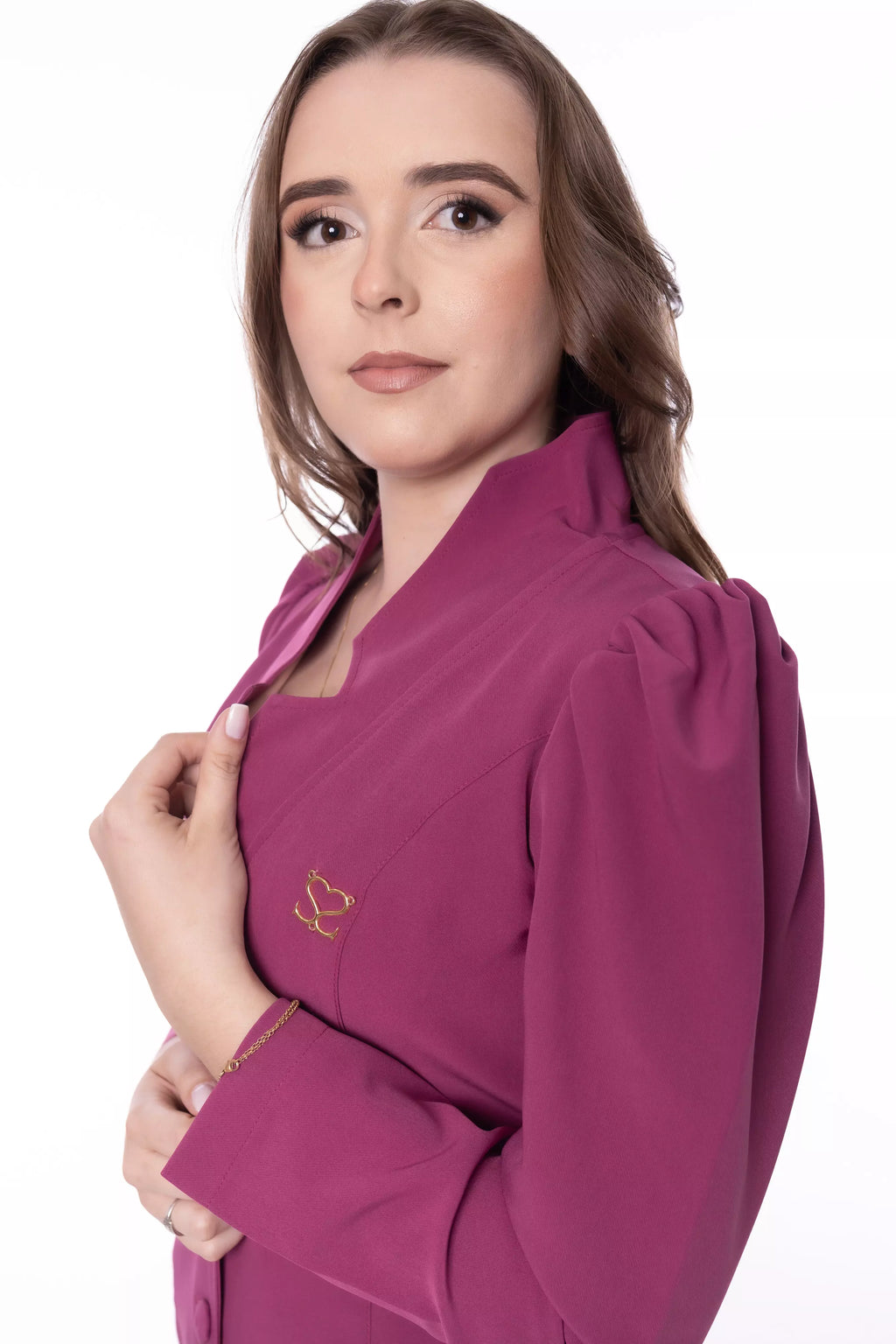 Seu diferencial está nas mangas bufantes, que adicionam um ar sofisticado e cheio de personalidade. A gola diferenciada traz um charme extra à peça, enquanto os botões forrados garantem um acabamento delicado e elegante. Para mais praticidade no dia a dia, os bolsos frontais funcionais unem utilidade e estilo, tornando esse jaleco uma escolha ideal para quem valoriza estética e funcionalidade.