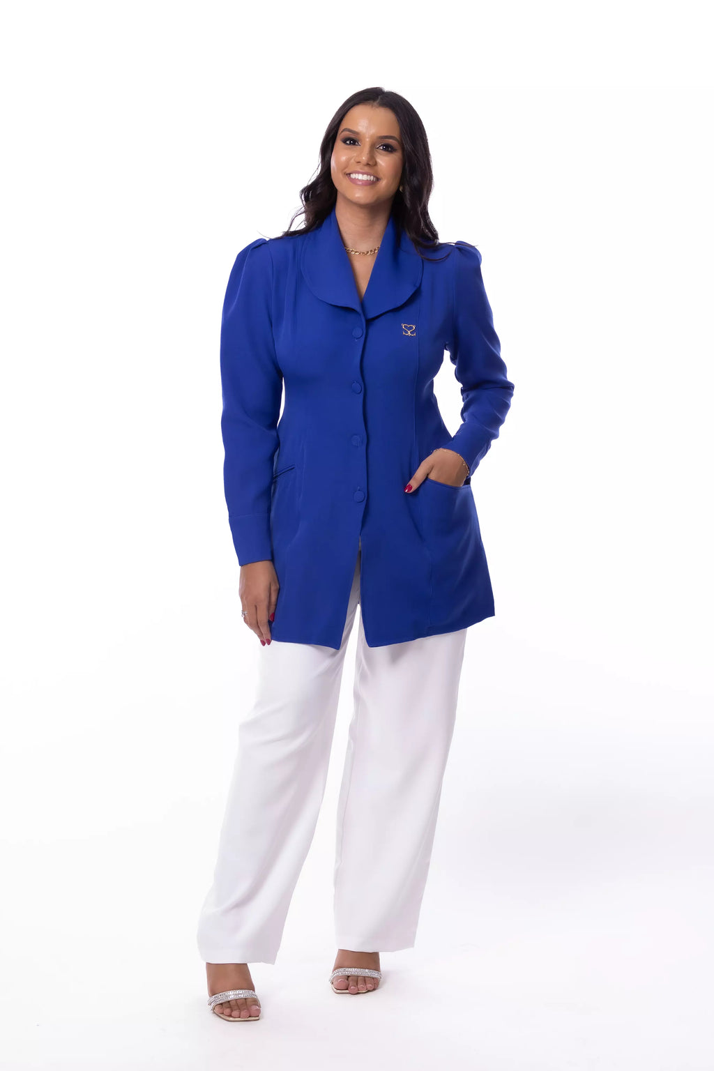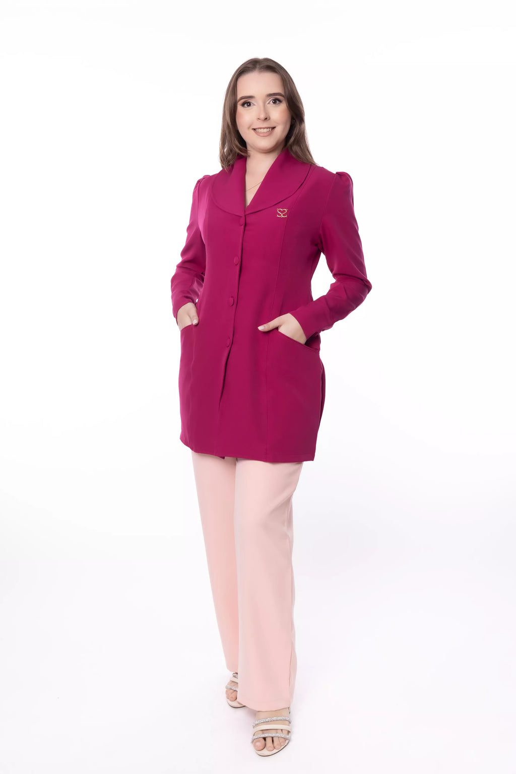 Seu design exclusivo se destaca pela gola ampla arredondada, que adiciona um toque clássico e refinado. As mangas levemente bufantes conferem modernidade e charme à peça, enquanto o fechamento com botões forrados reforça a elegância do jaleco. Além disso, os bolsos estratégicos garantem praticidade sem comprometer o estilo, tornando essa peça funcional e sofisticada ao mesmo tempo.