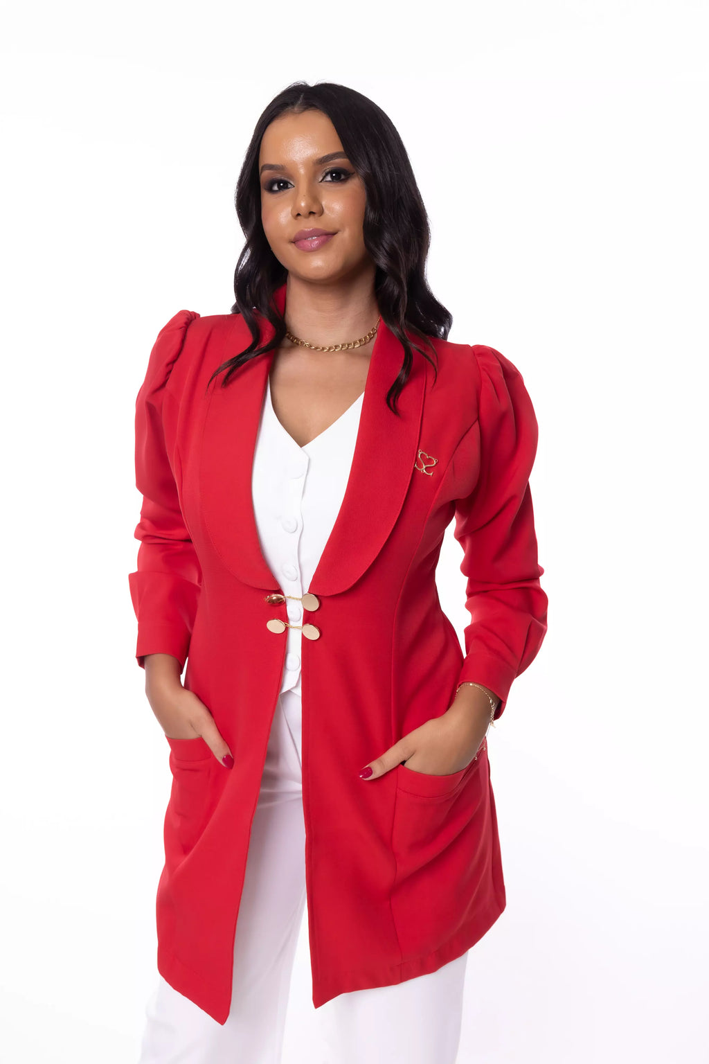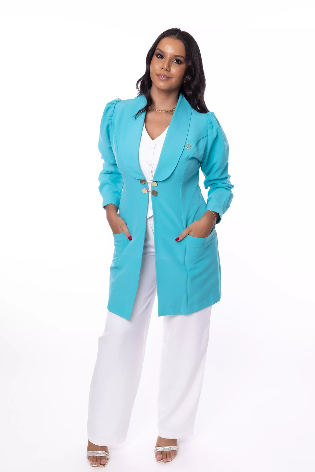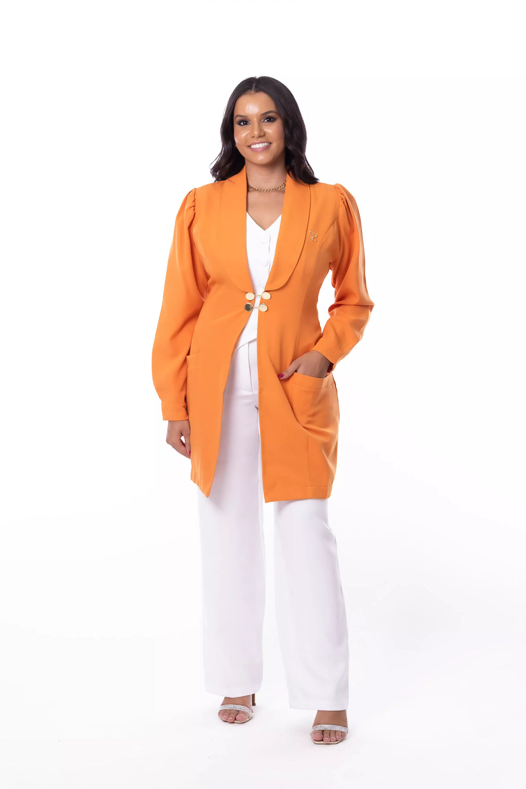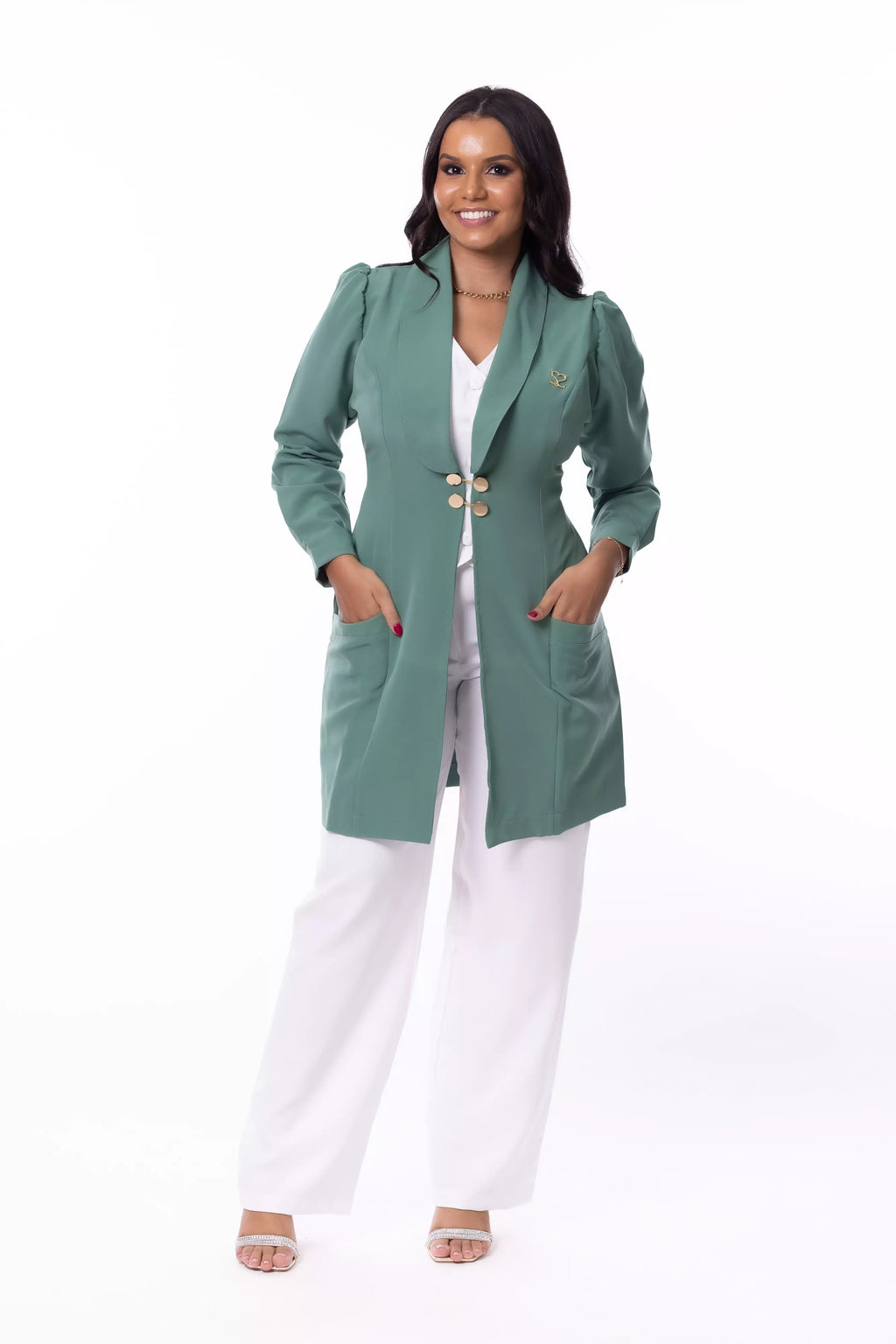 Seu design acinturado valoriza a silhueta, enquanto as mangas levemente bufantes adicionam um toque elegante. A lapela clássica proporciona um acabamento refinado, harmonizando com os botões dourados no fechamento frontal e nos punhos, que elevam o charme da peça. Além disso, os bolsos frontais funcionais trazem praticidade ao dia a dia, permitindo guardar pequenos itens essenciais com facilidade.