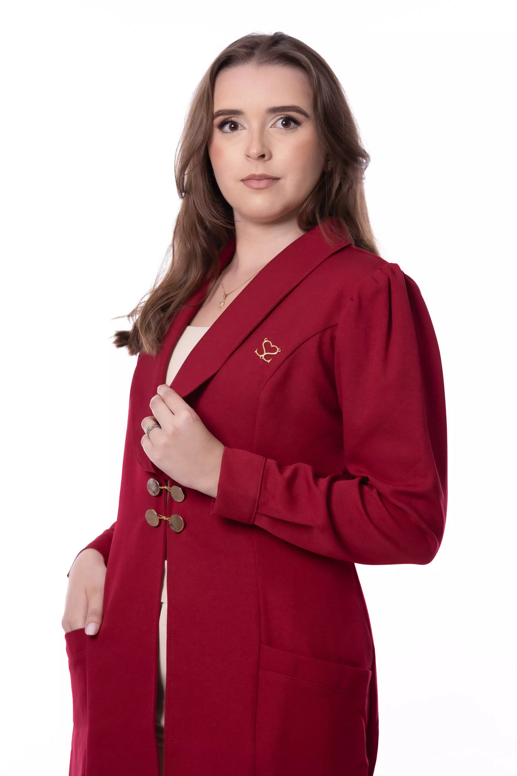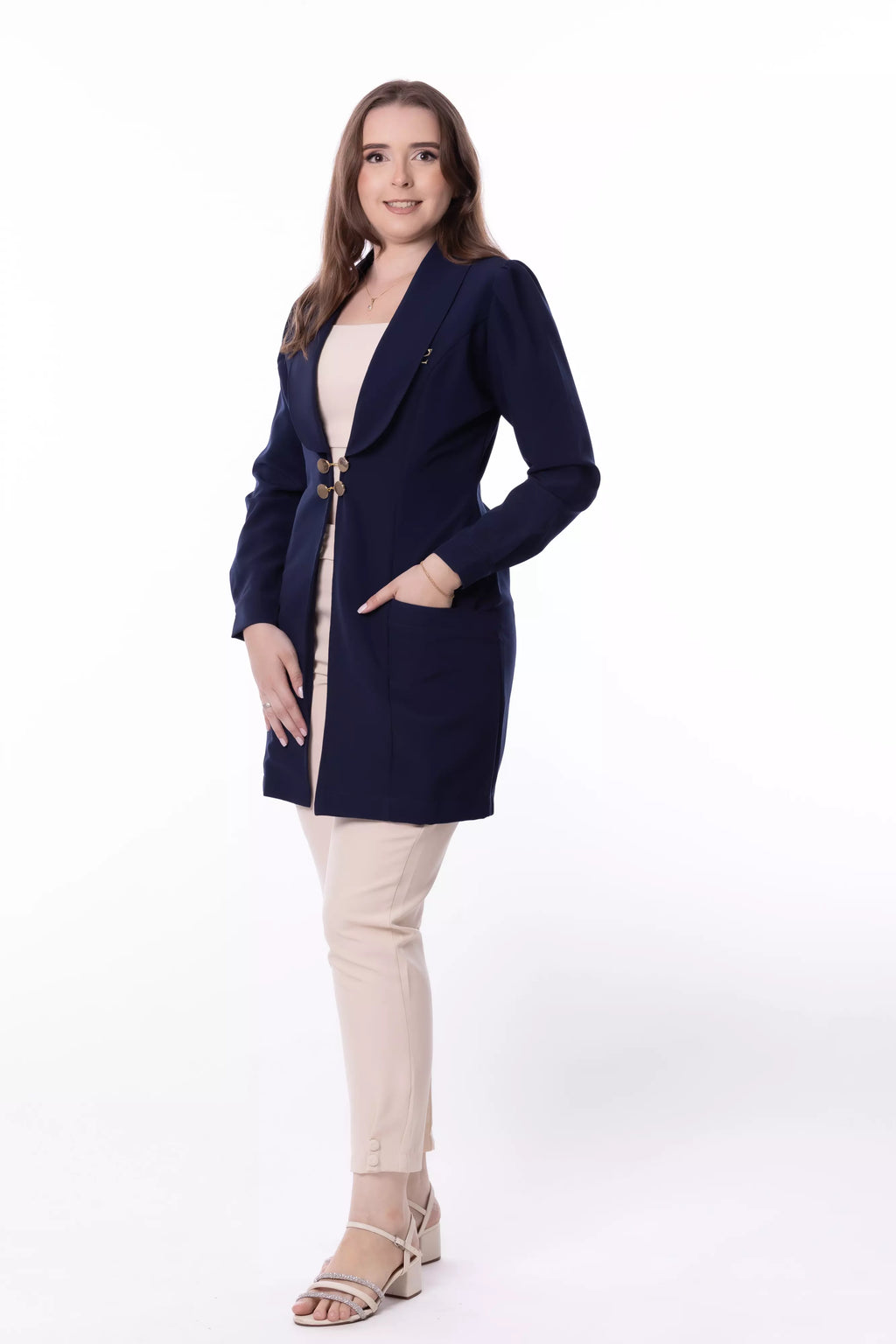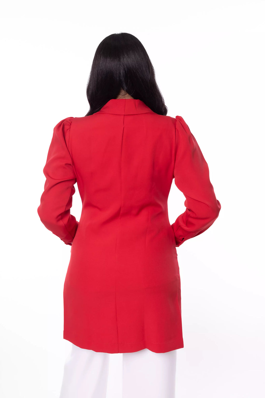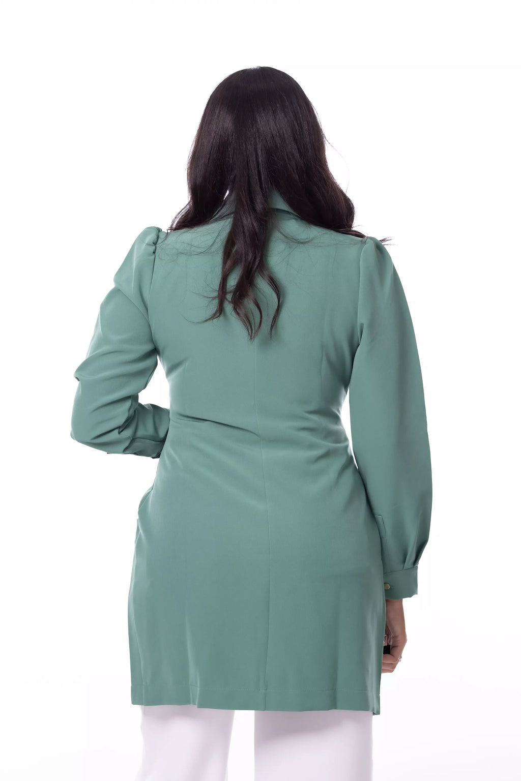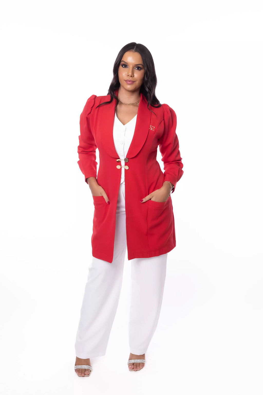 Seu design acinturado valoriza a silhueta, enquanto as mangas levemente bufantes adicionam um toque elegante. A lapela clássica proporciona um acabamento refinado, harmonizando com os botões dourados no fechamento frontal e nos punhos, que elevam o charme da peça. Além disso, os bolsos frontais funcionais trazem praticidade ao dia a dia, permitindo guardar pequenos itens essenciais com facilidade.