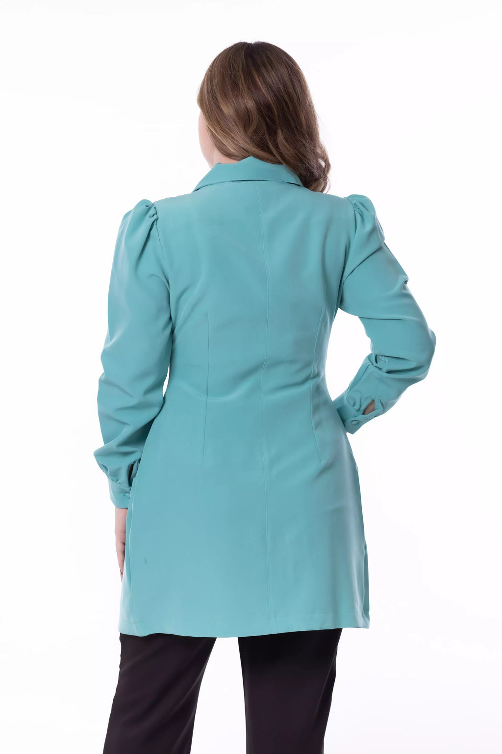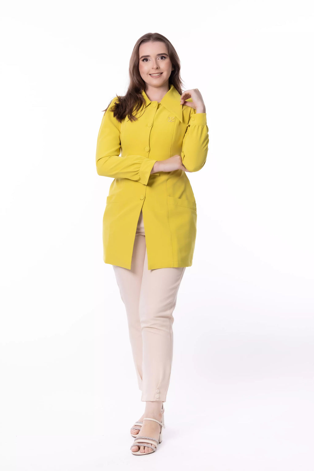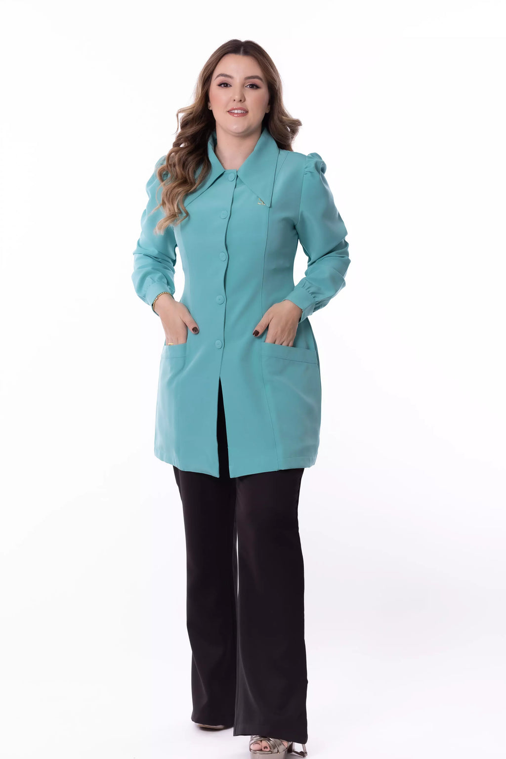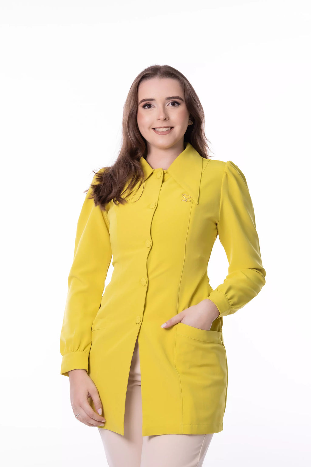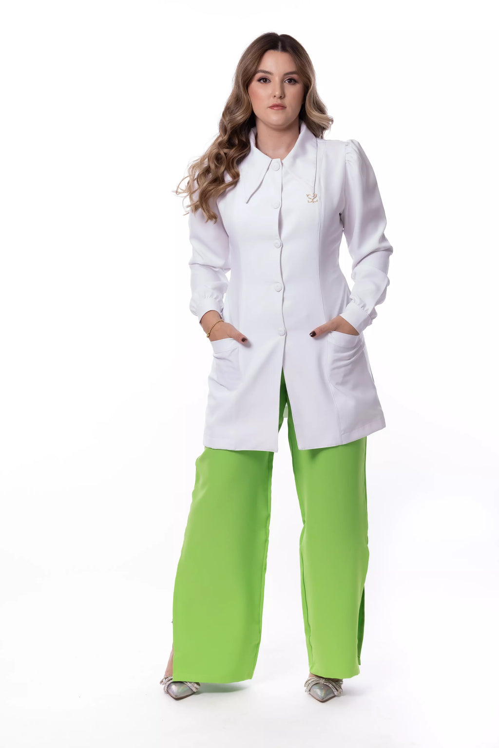 Seu design acinturado valoriza a silhueta, trazendo um ajuste elegante sem comprometer a mobilidade. As mangas bufantes adicionam um toque delicado e feminino, enquanto a gola pontuda confere sofisticação ao modelo. Os punhos com botões elevam ainda mais o refinamento da peça, criando um visual clássico e moderno ao mesmo tempo. Além disso, os bolsos frontais garantem praticidade para armazenar itens essenciais, sem comprometer a estética do jaleco.